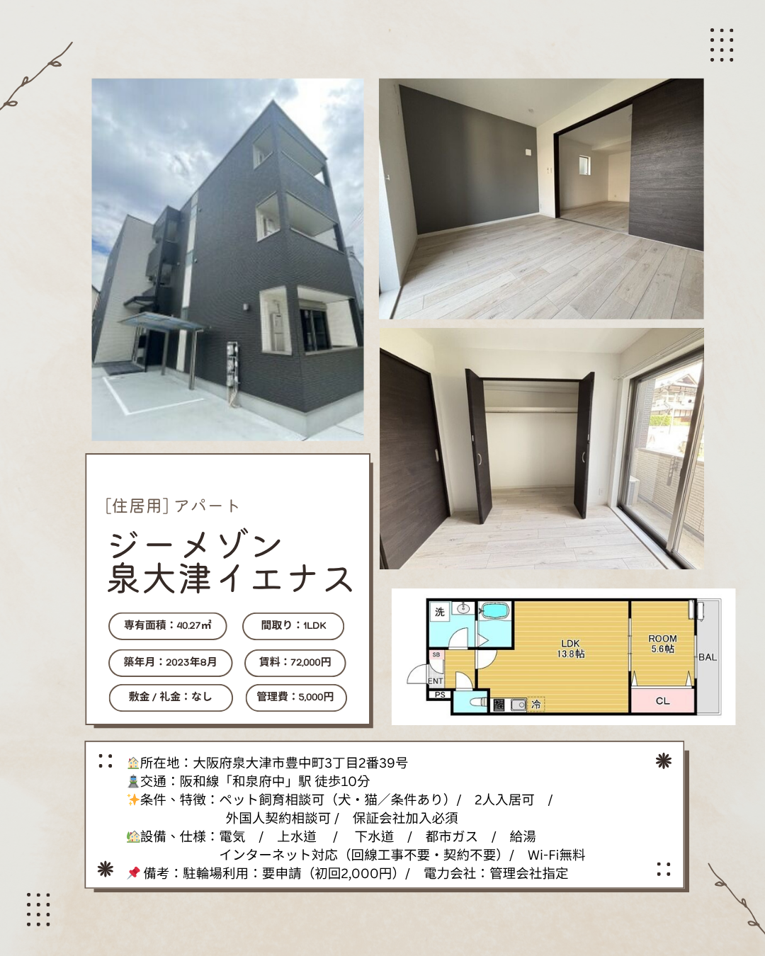 • 【新築1LDK】ペット可×Wi-Fi無料|和泉府中駅徒歩10分賃貸物件2026.04.06【新築1LDK】ペット可×Wi-Fi無料|和泉府中駅徒歩10分
